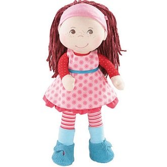 Clara will quickly gain a place in the hearts of little doll parents. She has a sweet and welcoming face, her pretty pink outfit with blue corduroy booties will become an instant favorite. Her soft body os perfect for cuddling! Material: padded body, chenille hair, cotton/polyester and velour dress. She is also hand washable! (Do not spin dry). 13.5 inches tall. Will fit into HABA 12 inch additional doll clothing sets.